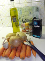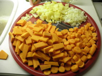 1°)  - Eplucher et couper en petit morceau les potirons, les pommes de terres et carotte